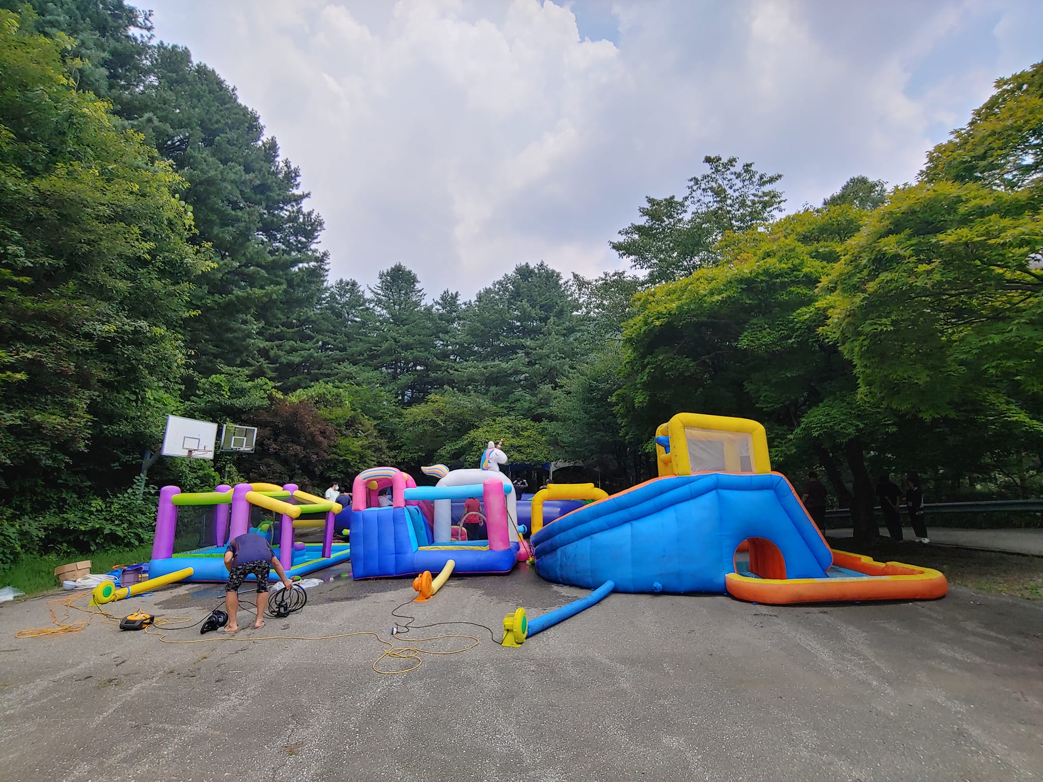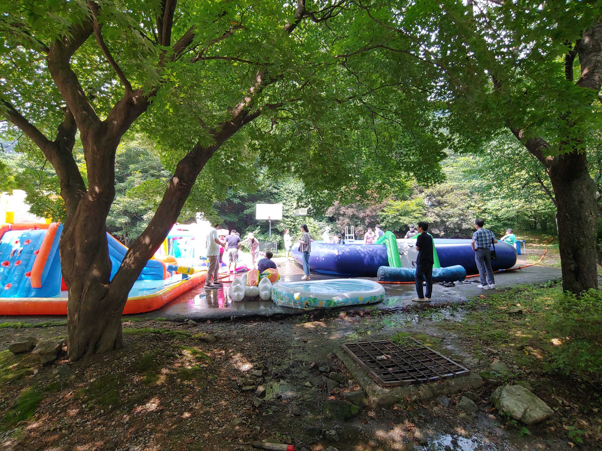 장애가 있는 청년들의 물놀이를 위해 수영장을 크기 별로 설치하고, 한창 나뭇가지에서 뭔가가 벌레처럼 떨어지는 계절이라 뜰채로 떠 내고, 신나게 큰 풀에서 또는 작은 풀에서 조심조심 물을 경험한다.